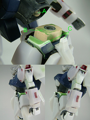 Aの部分はくり抜いてコクピットをオミットし、関節技ボールジョイント。同サイズのMGのポリキャップを埋め込み、キットのボールジョイント(下側)と共にエポパテでフレームを新造。